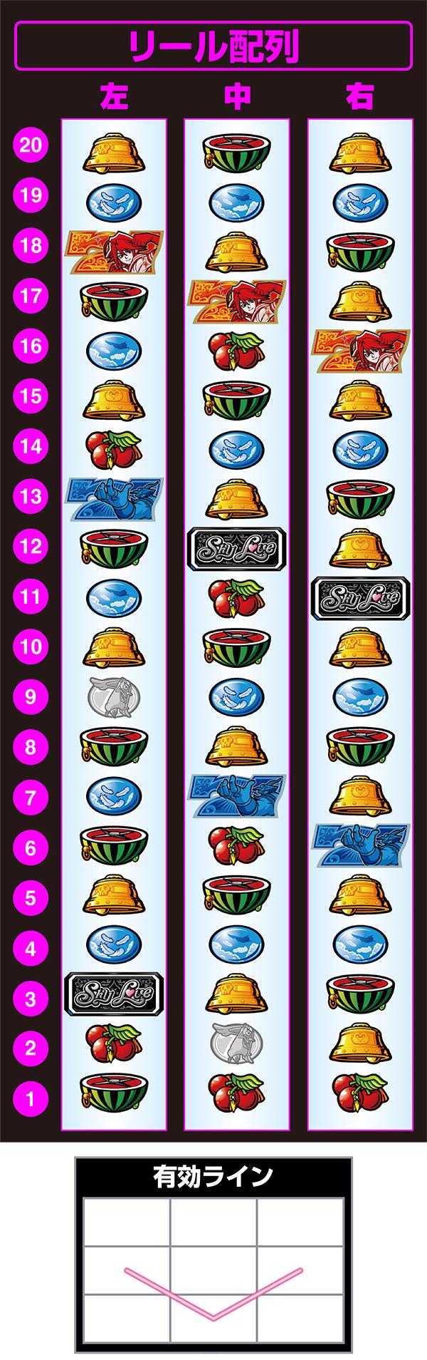 うむ。順押し、ハサミ打ちでもリプベルスイカがWテンパイないしトリプルテンパイしやすい配列になってるね。リプベルの成立・入賞をボカしたいなら左BAR狙いで順押し、小役の2確目を出したいなら青7〜赤7付近が良さそう。スリスはチェリーこぼしがどうなのか、だね。変則小Vラインの1ライン機だから、スイカ中段でも払い出しを受けられるかもしれないけど…ちょっと微妙かも。わからん。
