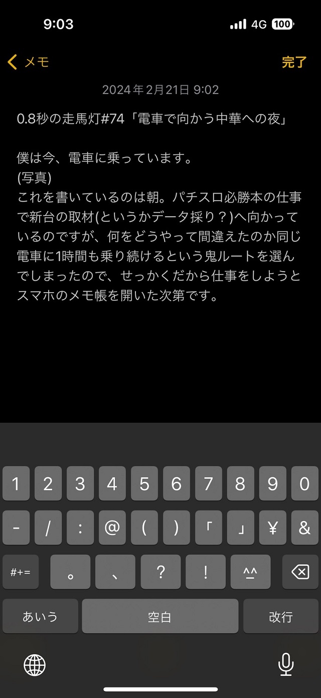 これを書いているのは朝。パチスロ必勝本の仕事で新台の取材(というかデータ採り?)へ向かっているのですが、何をどうやって間違えたのか同じ電車に1時間も乗り続けるという鬼ルートを選んでしまったので、せっかくだから仕事をしようとスマホのメモ帳を開いた次第です。
