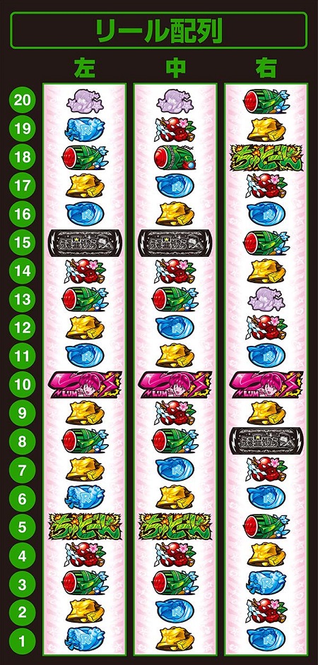 絵柄がド派手だけど、配列は淡白だよね。左・中・同じような配列が続いてる。右リールにスイカの取りこぼしポイントがあって、強そうな出目があるから、左・中・の順で押して右リールで決着をつける感じなのかな。それともチャンス目主体で液晶演出で決着つけたい感じ? 後者っぽいかなぁ。あ、でも左リールにベル・スイカ・ベルがあるじゃない。ちゅどーん絵柄を上・中段に狙ってのズルすべりで出すか、チェリーこぼし覚悟で枠上で赤7をビタ押しするか…あ、でも中段1ライン機か。ってことはコイツ、中段スイカか中段ボーナス絵柄でもチェリーの払い出し受けられるんじゃね? ダメかな?