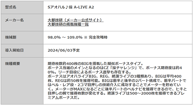 しかしBIGで400枚か。プレミアムボーナスなら最大で2000枚。たぶん通常時はREGとの凄まじい戦いになるよなぁ(笑) だって機械割を見てよ。技術介入込みで設定1が98%よ。これは2コマ目押しの技術介入頻度がかなり低いっていう証だと思う。つまりREGがまあまあ多め。でも設定1でもフル攻略で機械割が100%を超えないということは、そこそこの導入台数があれば設定状況にも期待できるってこと。これ大事。バラエティに1台とかマジでヤメてほしいな。