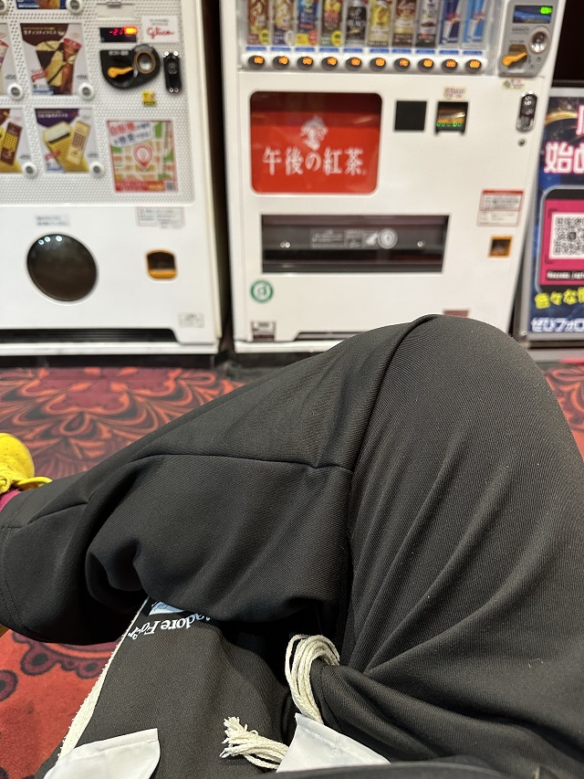 チラッと空いていないか見てきました。空いていません。でも今のところ全台マイナスです。そうね、3万負けぐらいで心が折れるはずなんで、あと30分から1時間で1台空くと思います。ここで大事なのは、ベガ立ちしないこと。通路からジッと見るのもダメ。新台は情報が少ないから、ヤメる時にものすごく心配になるんですよ。そうでしょ? 自分がヤメたら即押さえられそうな状況だったら、カマ掘られるのが嫌っていう理由で粘られちゃうんです。だから気配を消すのが大事。こうして遠く離れたソファーから様子を伺うのが吉なんです。それが20年、絶対に確保しなきゃいけない新台を逃し続けたライターの経験則です。