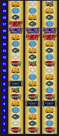 赤いな笑! こんなんリール回ったらほぼピンクよ笑! でもスイカがサイコロになっててカワイイね。ゲーム性はまったく知らないけど、たぶん原作ゲームっぽく通常時はスゴロクでしょ? で、レア役でマスが大きく進んだりCZに入って、目的地でAT突入みたいな。知らんけど。ピンクの絵柄(たぶん左リール・チェリー付きのBARも)は一直線になったら有効のチャンス役かな。これとレア役の合算がまあまあ高くて、固めて引ければ初当りとかCZからのATとかAT中の上乗せ・継続が見込める感じなんだろうね。