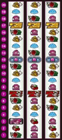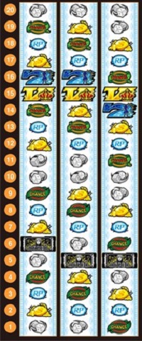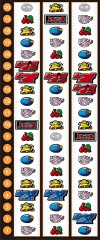 不二子2は5番に青7があって、4番がリプレイだったのよ。んで、3と4の間にプラムがあったおかげでプラム・ベル・プラムっていう配列になったんだけど。BARを削ってブランクを足してっていう配列変更の影響がココに出てしまったんですな。たぶん押し順フラグを構成するのに20コマでBARが2つは無理だったんだろうな、と。許す!