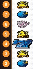 気になるのは左リールにチェリーが一つしかないのと、スイカも各リールで取りこぼしうる配列になっている点。モンハンって、特にAT中はハァハァしちゃうじゃない? 小役なんか狙ってる場合じゃねぇってなるじゃん? だから、ちょっと取りこぼしが起こりやすい配列になっているのは、打つ手にとって不利かなぁって。あ、でも有効ラインが下段からの小山型なんだね。えーっと、っていうことは…左リールはリプレイ下段、中リールは中段に菱形ブランク or BAR、右リールは下段スイカでスイカ入賞か。あ、右リールは紫7がスイカの代用? ほほう、じゃあ中リールだけ狙えばOKなのね。まあハサミ打ちしていれば安心ね。
