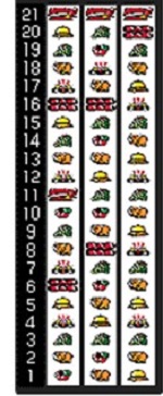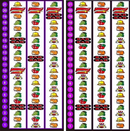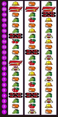 拾いモノで悪いんだけど、ありました。あー、赤7上段で中段にベルか。っていうか、この配列だったら左リールで小役奪取しながらメチャクチャ出目で楽しめるじゃん! 予告音と死ぬほど絡むパターン見つけられるじゃん! 16番のBARを下段にビタしたら、どういう停止型になるんだろうなぁ…ああ、打ちたいなぁ。ハイパージャグラーだったら家スロにしてもいい。