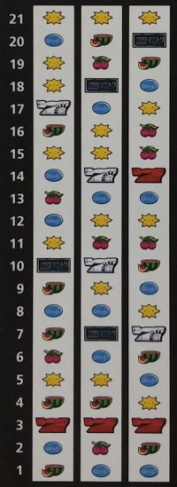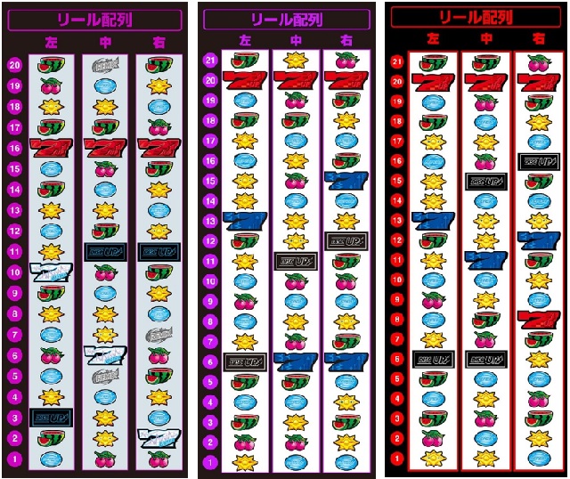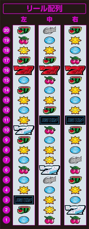まず今作は擬似ボーナスです。内部的にはAT機で、配列はこれまでの21コマから20コマに変更されています。つまり、1コマどこかが削られたんですね。さて、どこかわかりますか?
