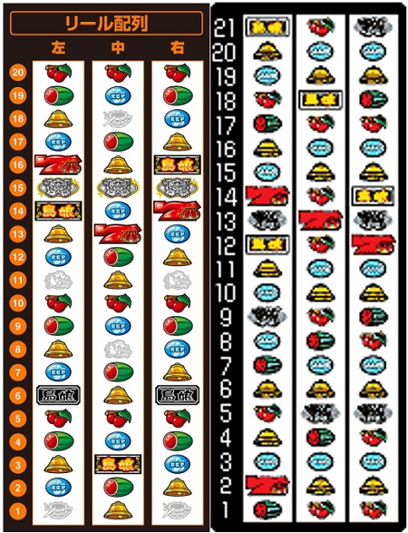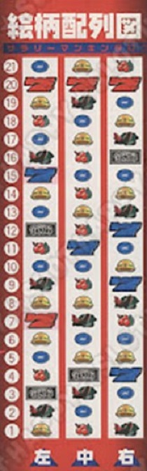中リールと右リールにブランクがあるのは何だろう? 20コマに変更されているから、その辺の帳尻合わせかね。中リールのチェリチェが強そう。ゲチェナもあるし。まあ強そうって言っても、有効ラインはおろかシステムすら知らずに書いているんですけどね(笑)