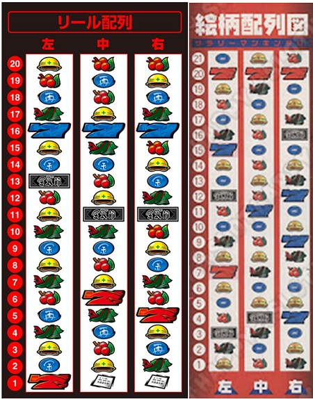 あ、結構違うね(笑) 4号機の方は左リールに赤7が2つ、右リールに青7が3つもあったんだ。すげぇな、そんな台は他にないんじゃないか? 僕は4号機のサラ金をほとんど打っていなかったから、リーチ目とか全然知らないんだけどね。それでも左リールの上段に青7が止まると強ハズレ目(今でいう強チャンス目)or ボーナスだったよね。んで中リールの上段に青7が停止する「青テン」は強ハズレ目 or BIGだったんじゃなかったっけ? とにかく嬉しいAT or BIGの2確目だった気がする。違ったらゴメン。たぶん、配列を見るとスマスロサラ金はそこらへんを継承してるんだろうね。そのための配列になってる、といっても過言ではなさそう。小役サンド目フェチとしては左リールからベルサンドの赤7が消えちゃってるのが残念。たしかボーナスの1確目だったと思うんだけどね。まあまあ、それよりも青7上段を優先した、と。アツさ、知名度としてもそっちが優先されるのは当然だから仕方がないよなぁ。