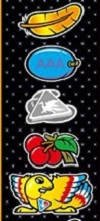 ここのブランクがとにかく見栄え悪くってね。僕は4号機の頃、チェリー付きの鳥を狙うのが好きだったんですけど、このブランクがあるせいで付近を狙わなかったんです。あ、あくまで好みの問題ですよ? 4号機のアレックスはこのブランクが赤7だったんです。うーん、でも赤7を戻すとは思えない。左リールに赤7が2つあると、小役狙いの時に「どっちの赤7かわからない!」っていう声が続出すると思うんです。だからブランクのままか、ブドウを置くか…うーん。