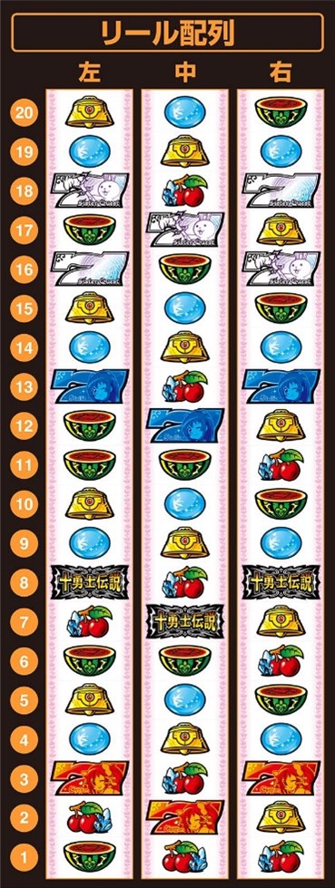 そんな仕様なんじゃないかな、と。BAR揃いに書かれた十勇士伝説っていうのが気になるけど…うーん。開発力に定評のあるカルミナさんですから。↑に書いたような単純なゲーム性じゃなくて、もっと別の何かの可能性はありますよね。ただ、リーチ目は絶対にあります。それだけは間違いなく、配列にハッキリと書いてありますから。リーチ目が主体の台ですって。