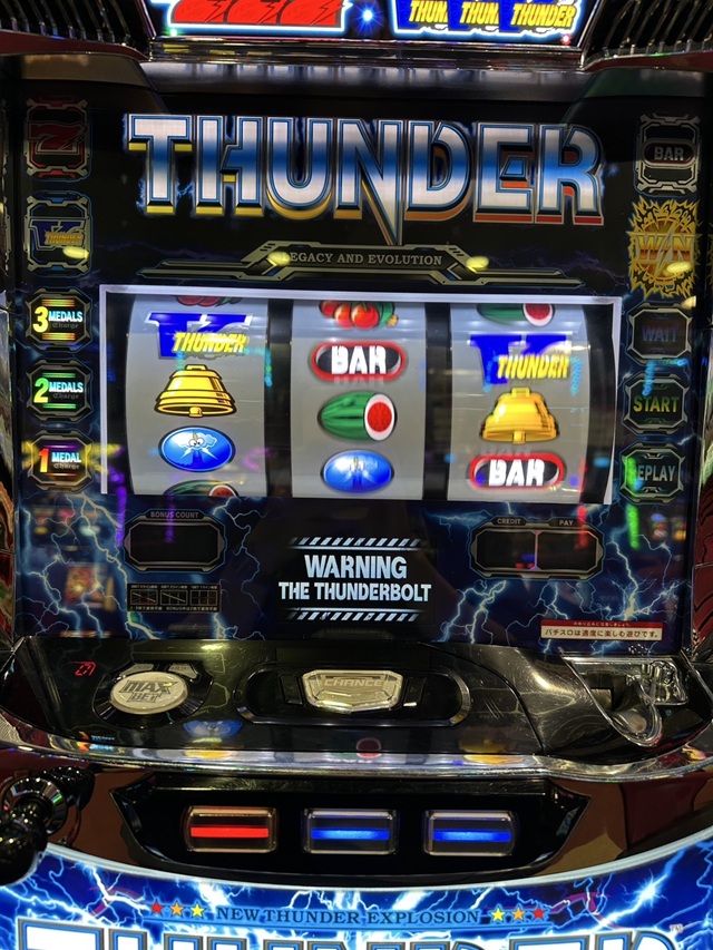 予告音が鳴って左リール上段に単Vが停止して消灯。体が勝手に、右リールどこを狙うか悩みやがる。ハサミ打ちで右リール枠上にVが止まってジ・エンド。でも顔はちょっと笑ってる。ほら、ちゃんとサンダーじゃん。そんなこんなで思い出しながら色んな所を狙っていたら、500Gハマり。ほら、サンダーじゃん。1万円しか使っていないところがライトニングちゃんではあるけど。