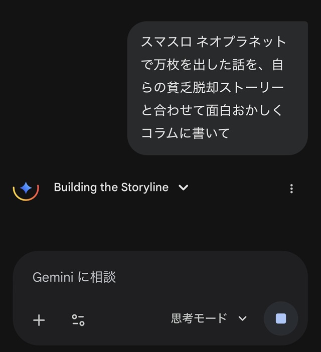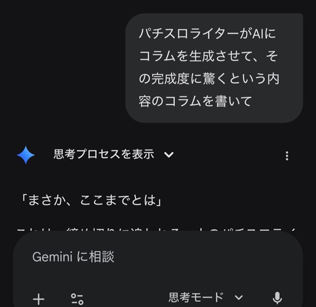まさか、ここまでとは。すげぇ。普通に書けてる。マジかよ。なんかちょっと文体が自分と似てるのは気のせいなのか? こんなコラムが1分で書けちゃうのか…うーん。まあでも文章は大丈夫。AIに書かせる意味なんてないからね。僕は僕が書きたい、読みたい文章を自力で書くことができるので。でもこれを使って小説とか、 コラムとか生成して、 連載しちゃう人だって出てくるよなぁ。怖いなぁ。AIがパチスロの知識も完璧に保管したら、 仕事はなくなるかもしれませんね。まあ、そうなったら僕もAIを使って仕事するからいいけど。はっはっは!
