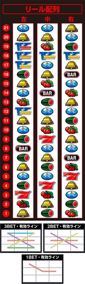 まず単独BARがなくなりました。これはリボルトで僕が見出した逆押し単独BAR狙い、通称「雷神殺し」を封じたということです。あの説はすいませんでした。でも面白かったのよ。スイカの成立を1リールで見抜けたり、ベルor BIGがあったり。今作はもう左からばっかり狙うので! すいません! 勘弁してください!