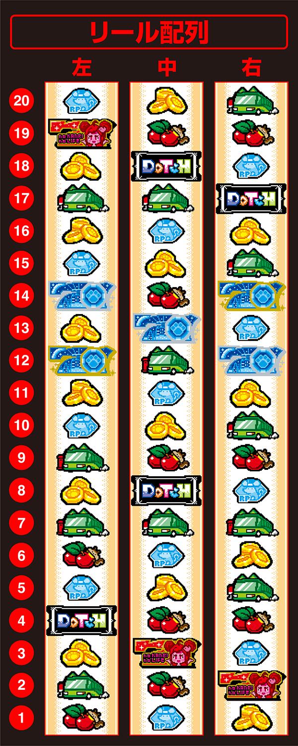 左リールの狙える箇所がいっぱいありそうです。まずはBAR狙い。上段BAR停止からのハサミ打ちで右リールは適当押し。小役がスイカ(バス)がテンパイしたら中リールはBARか青7を目安にスイカをフォローします。右リールの配列を見た感じ、ベルとスイカがWテンパイして何も揃わなかったら、おそらくリーチ目でしょう。とっても慣れ親しんだ小役狙いができそう。左リールBAR上段、右リール中段リプレイもチャンスになりそうだけど、どうでしょう? 右リールの青7・リプ・青7は強そうだし、2確になりそう。っていうか、これが強くないと正直わからん(笑) 左リールのBAR付近はチェリーが2つあります。だからアバウトに押してもOKですね。スベリを伴ってリプ・BAR・ベルのカタチになったら小役orボーナスor何かにはなりそうですが、あくまで擬似ボーナスのAT機ですからね。押し順ベルが存在するはずなので、一概にこうとは言えない…だが、それがいい。フラグとしてあるかはわかりませんが、チャンス目もあるかなぁ。こちらとしてはない方がありがたいけど、チャンス目の扱いが強いなら、AT中(もしくは連チャンゾーン中)はむしろあった方が助かるかもしれない。