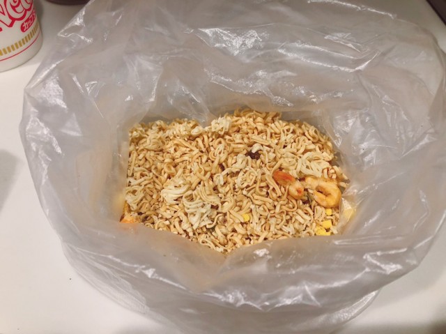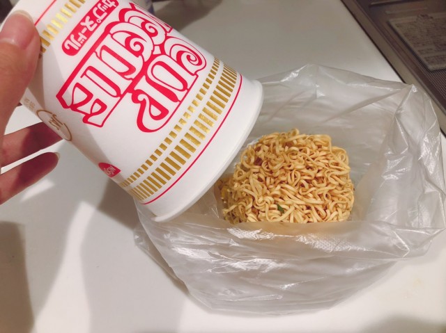 カップヌードルを開け、中身を全てビニール袋に移す。