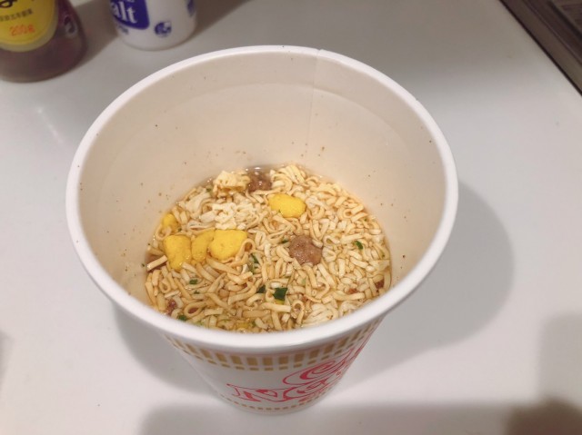 ふやかしたカップヌードルを汁ごと投入。