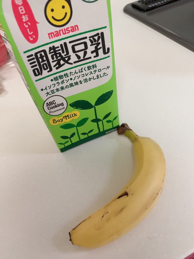 バナナの皮を剥いて4等分くらいに切る。そこに豆乳を入れて、ミキサーやフードプロフェッサーなどで混ぜたら完成☆