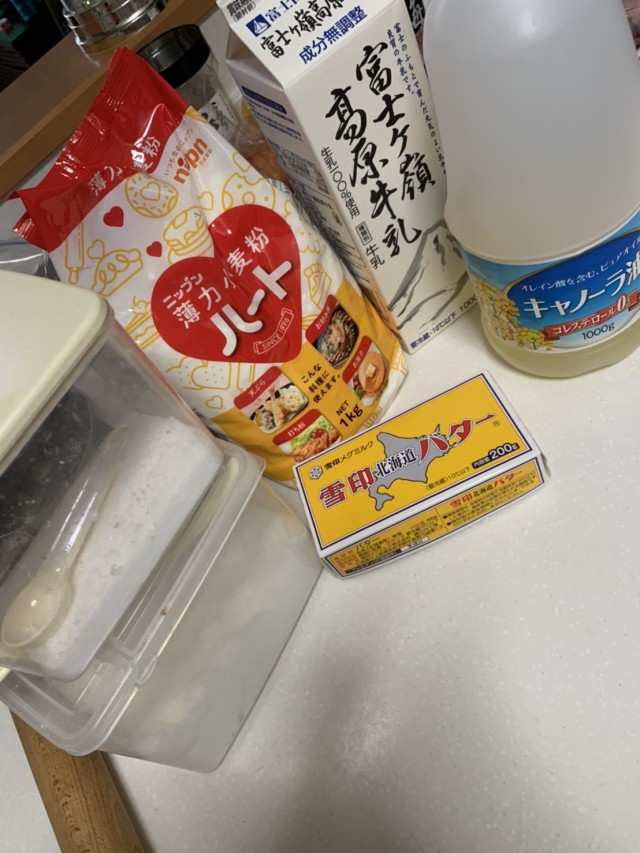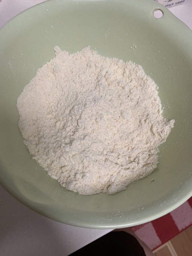 ボウルに小麦粉.ベーキングパウダー.砂糖.塩を入れてしっかり混ぜる。