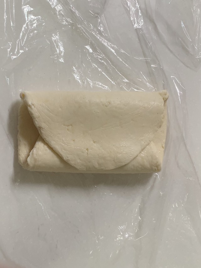 冷やした生地を取り出したら、めん棒で1.5cmくらいの厚さになるように伸ばして3つ折りにする。