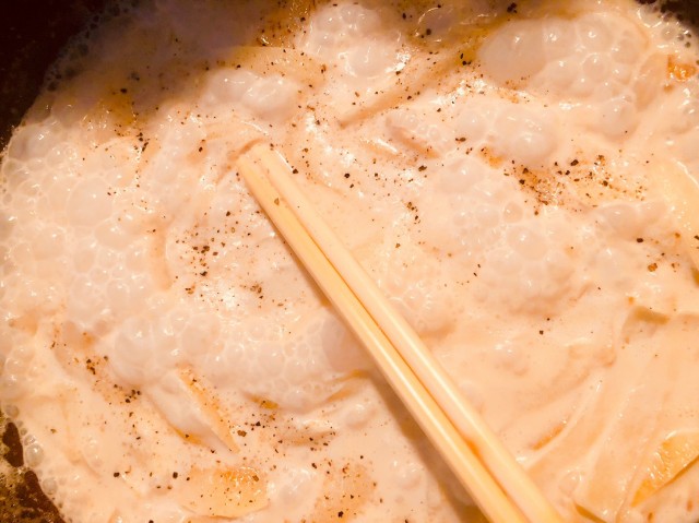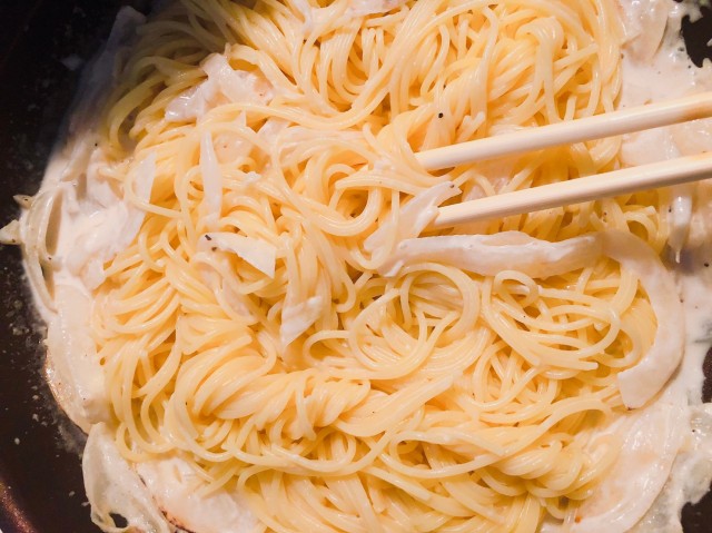 生クリーム不要の簡単カルボナーラ。コスパもよさそうだし、真似してみる価値はありそう。欲を言えば、ビッグフランクをトッピングしてほしかったな、キャラ的に。