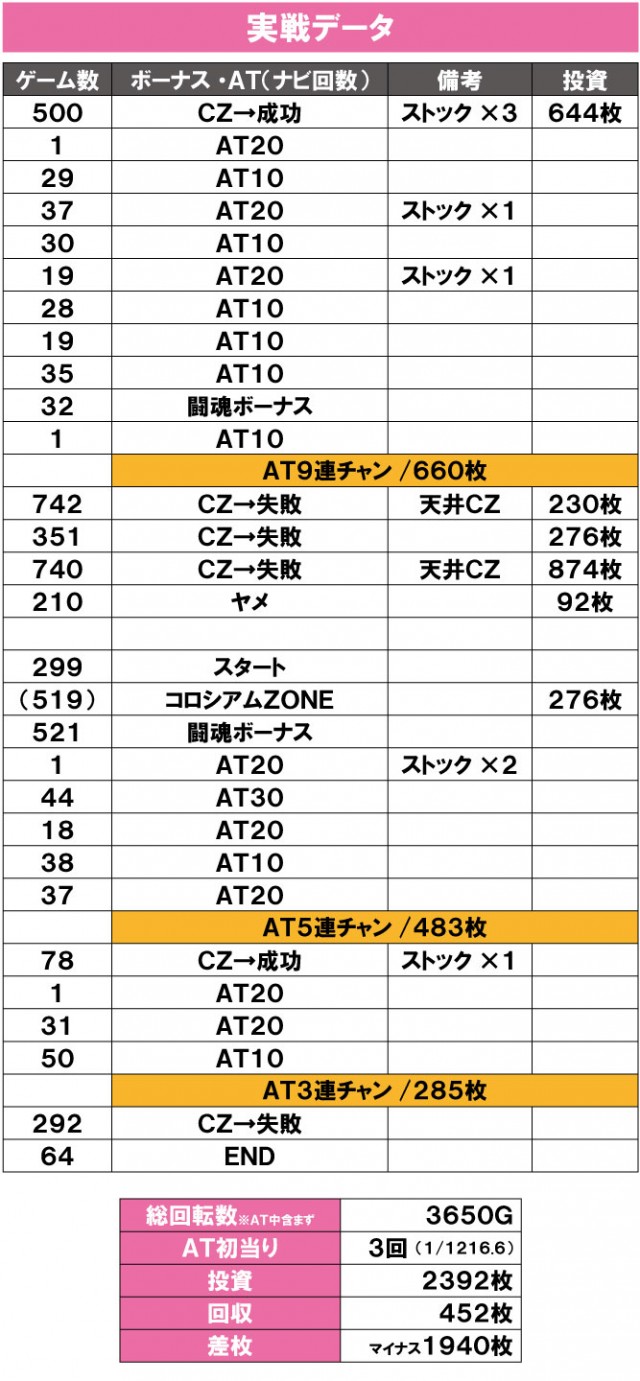 しっかり50%を射止め、闘魂ボーナス+ATに当選です! ちなみに「コロシアムZONE」突入率はガッカリすることが多い=怒ポイントが貯まりやすい設定1であっても1/3205.3。恩恵の内容から考えても積極的に狙っていく必要はなさそうなので、突入したらラッキーぐらいに考えてよいのではないかと私は思います。