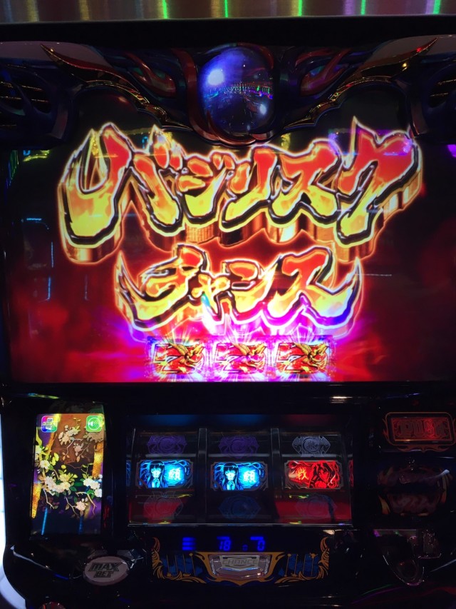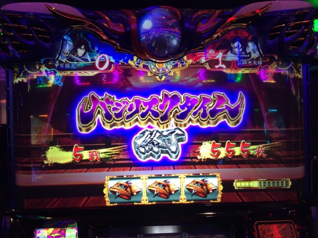 調子が良さそうな隣の台はポンポンBCに入るのに。そんな中3回目のBC入賞時に赤7揃いで本日初のバジリスクタイム確定!