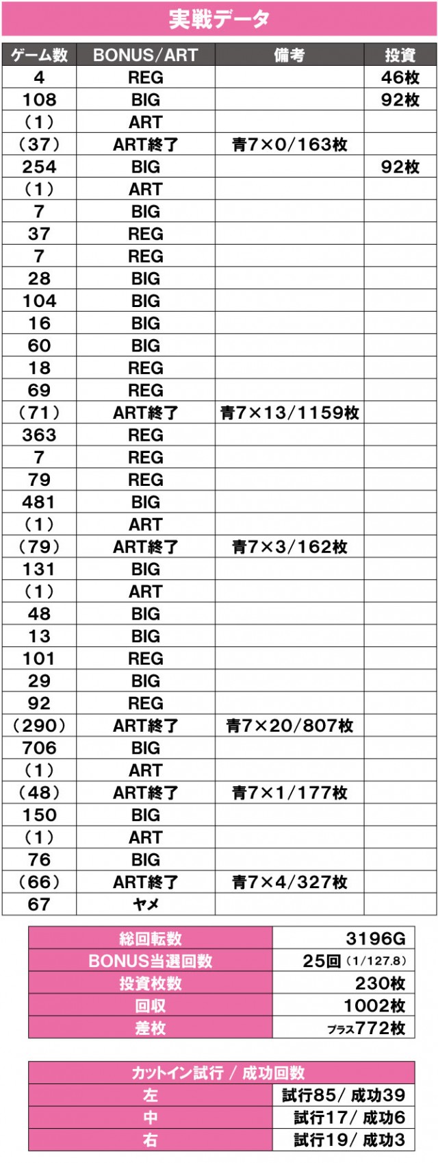 設定を見極めてしまえばこっちのもの、といったところでしょうか。大きくG数を乗せたART中にBIGボーナスを引く、そこでまた青7を揃え上乗せをする…。