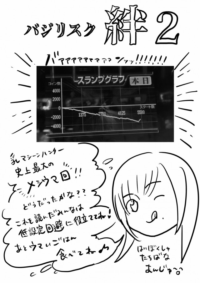 初代バジ絆がホールから姿を消して約2ヵ月後。早くも6号機で絆が復活! この回はねぇ…、企画史上最も辛かった回ですね。この日の辛さは海馬に染み付いて、今でも時折苦しめられます。重症。