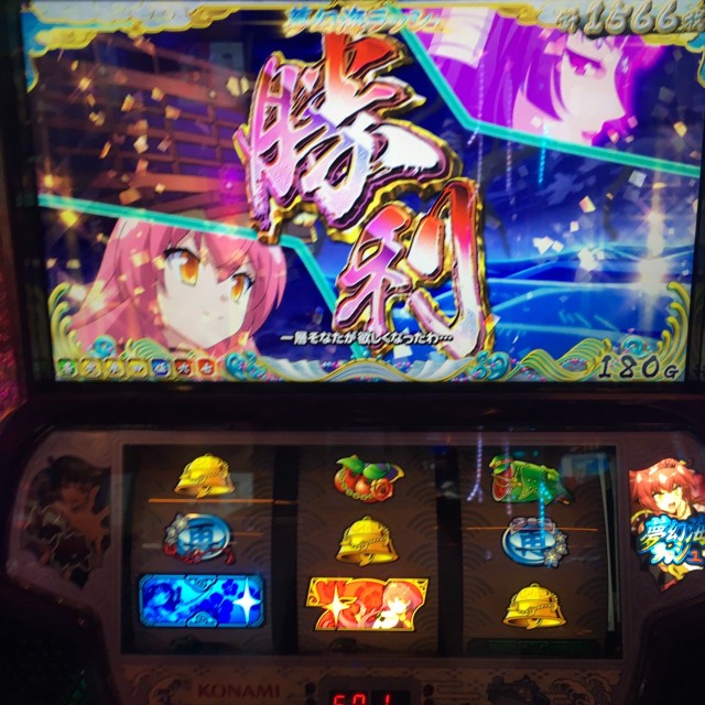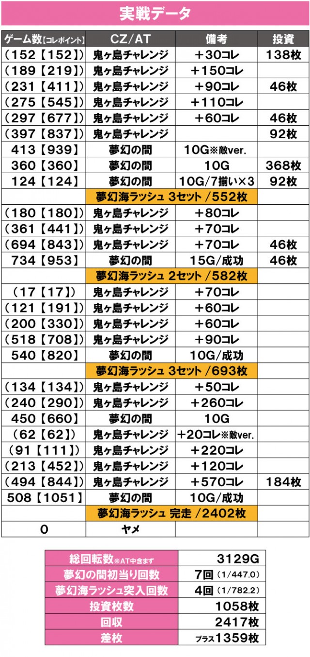 この日の「夢幻の間」初当りは、コレ数にして939コレとなかなかな数字ですが、頻繁に入った「鬼ヶ島チャレンジ」でコレ数を稼いだので、消化ゲーム数で見ると、413Gでした。