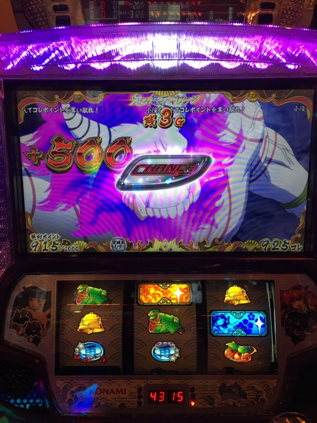 ハマリの最中に突入した「鬼ヶ島チャレンジ」。なんとここで、強チャンス目から一撃500コレ乗せが!!