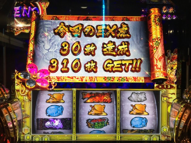レア役や無法システムで、更にEX虎武威を乗せていく…。もう乗せに乗せすぎてデータを取るのもままならなくなった頃、遂に…