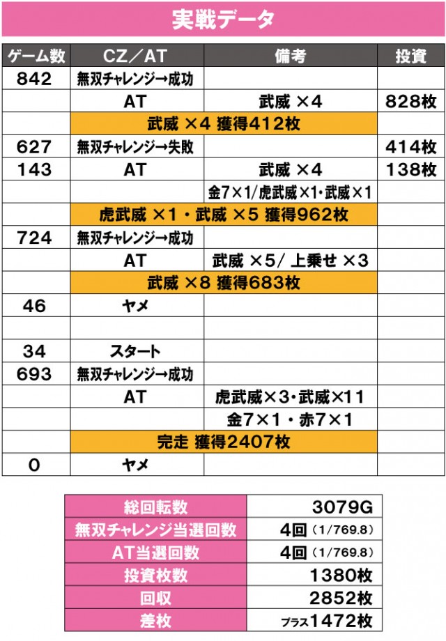 本ATの要と言われている「EX虎武威」を3個、通常「武威」は11個と、大量ストックの獲得に成功。