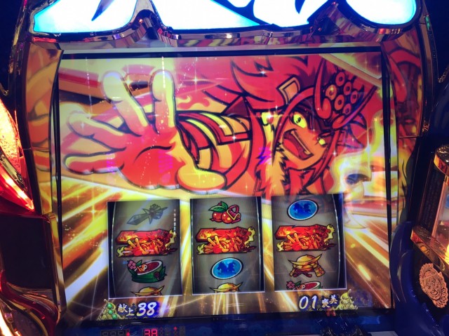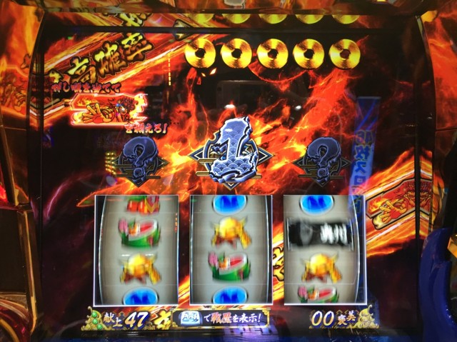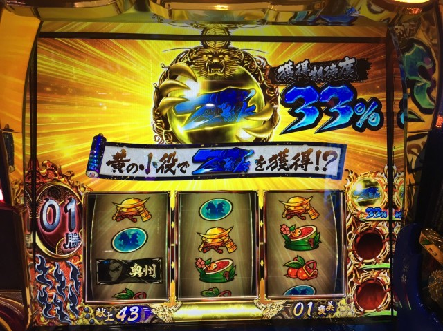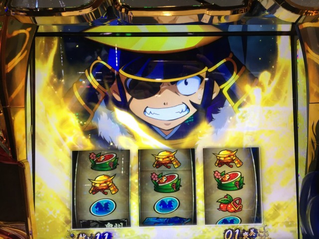 これは終了後「六文銭チャンス」という6GのST型特化ゾーンが必ず付いてきて、1/3で発生する2択の押し順当てに成功し赤7が揃えば「幸村ボーナス」当選。さらにループする仕組み。