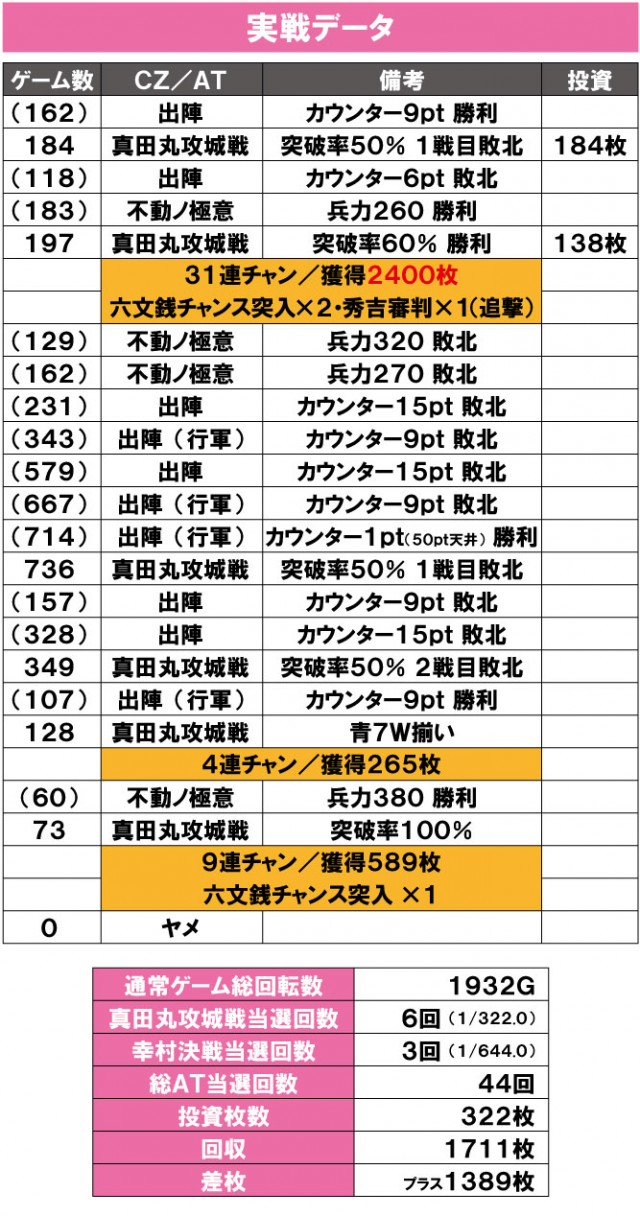 完走後はハマり、出陣ポイント計50ptで到達の天井まで連れていかれ、尚且つ天井恩恵の真田丸攻城戦も1戦敗退。