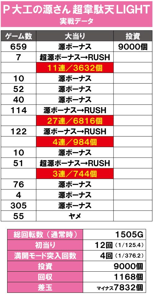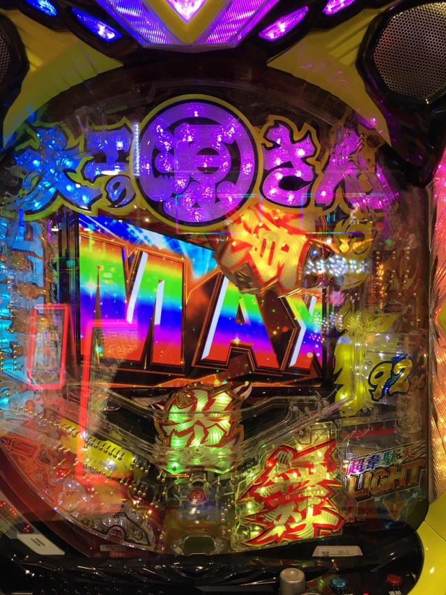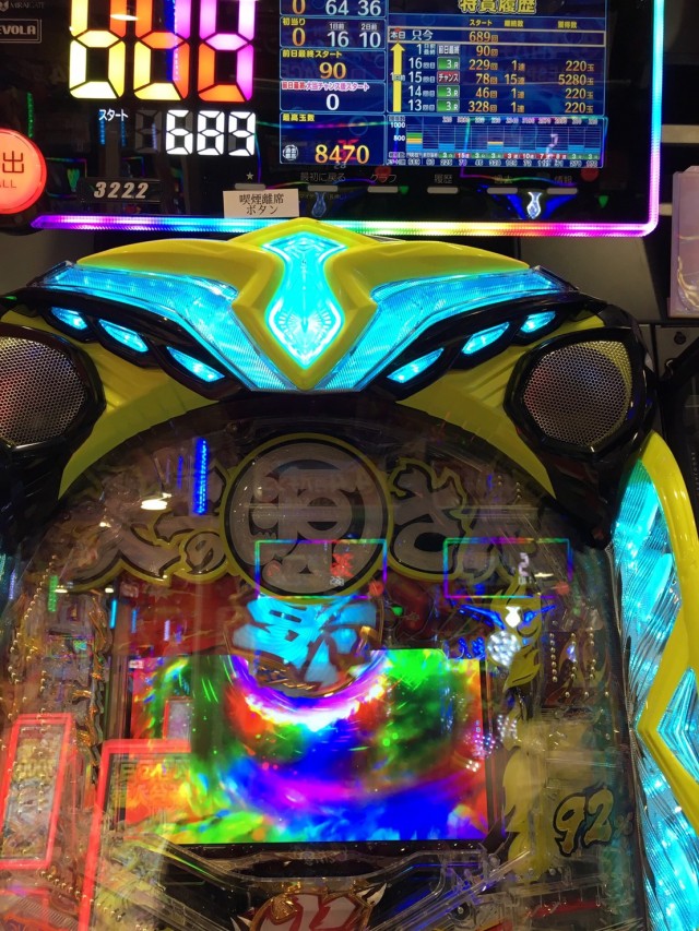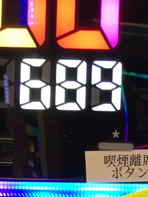 周りの台がライトの特性を活かし100回以内で初当りをゲットしていく中、まさかの689回ハマリ。そして肝心の超源チャレンジでも、ラッシュ突入ならず。