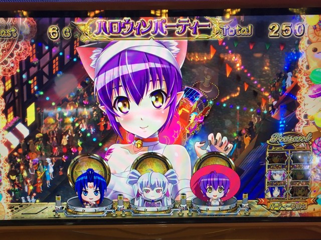 どういうことになるかというと、最初の『ハロウィンパーティー』でキャラを獲得していき、ボーナスを引いたらボーナス消化中にもキャラの獲得抽選があり、ボーナス消化後にまたまた30G『ハロウィンパーティー』を消化。ここでも当然キャラが獲得できます。
