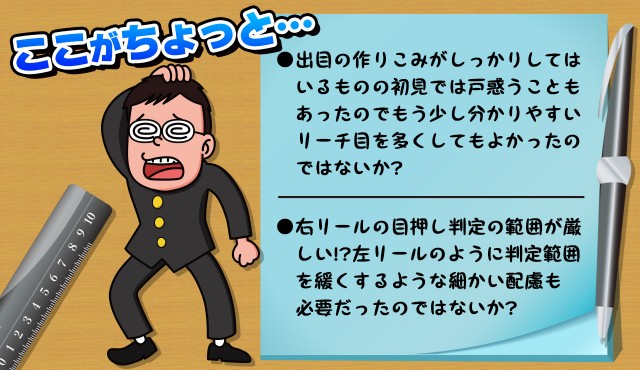 個人的には『ディスクアップ』を引きずりおろすには、小役のダブルテンパイハズレなどインパクトの強いリーチ目を多めにしておいてもよかったのかなと。そうすればライトユーザーも食いつきやすかったのかなと、ふと思いました。