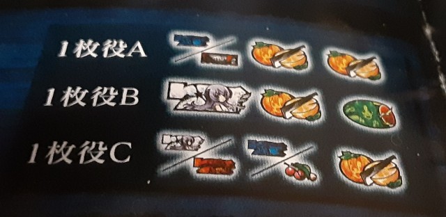 まず、3種類ある1枚役の存在ですかね。「青7orBAR・オレンジ・オレンジ(1枚役A)」「白7・オレンジ・スイカ(1枚役B)」「白7or赤7・青7orチェリー・オレンジ(1枚役C)」の計3種類。