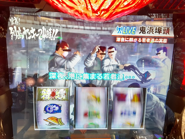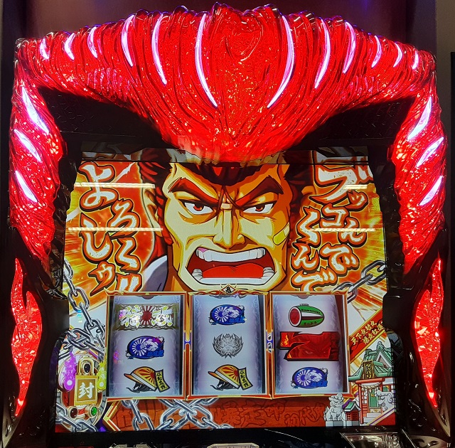 見てください。この筐体上部のリーゼントが印象的ですよね。ベルコから満を持しての登場となったシリーズ最新機種『鬼浜爆走紅蓮隊 狂闘旅情編』。コイツを多ベンにブッコんでいきましょう!