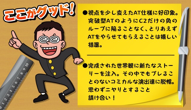 それを実現できたのは、通常時に押し順1枚を設けて低ベースにしたということと、あとは純増を5号機のAT機基準に抑えることで、まわりくどくなくATからスタートさせることが可能になったんだと思います。