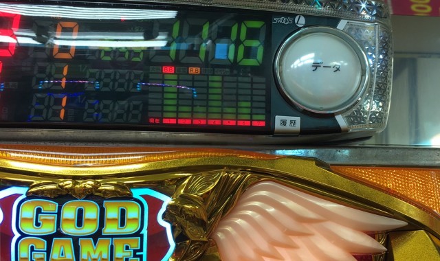 趣味打ちとはいえ負けを抑えるのは大事なこと。なので、台選びをするに辺りデータカウンターを見渡していましたら、なんと1050Gほどで空き台になっている「ミリオンゴッド神々の凱旋」があるではありませんか!