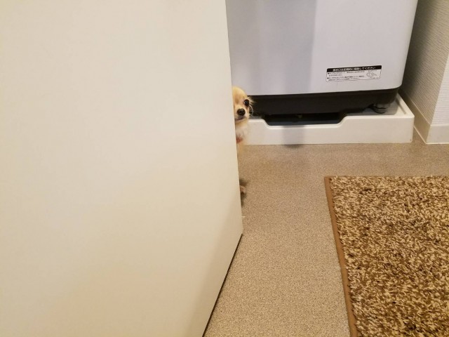 ママに怒られてドアの隙間に隠れるつくね
