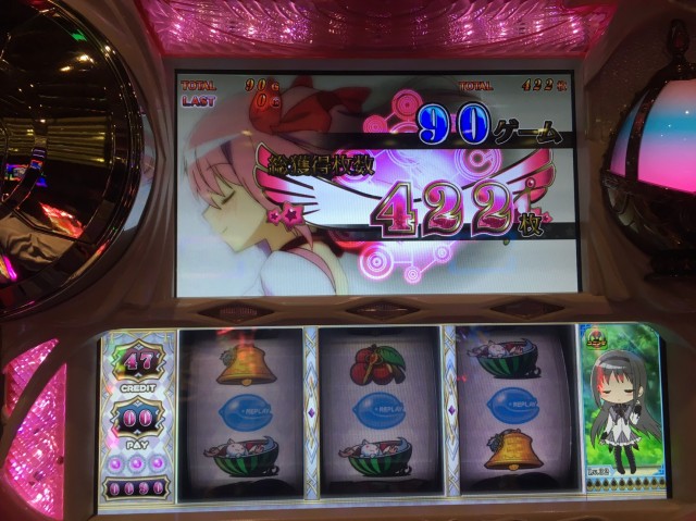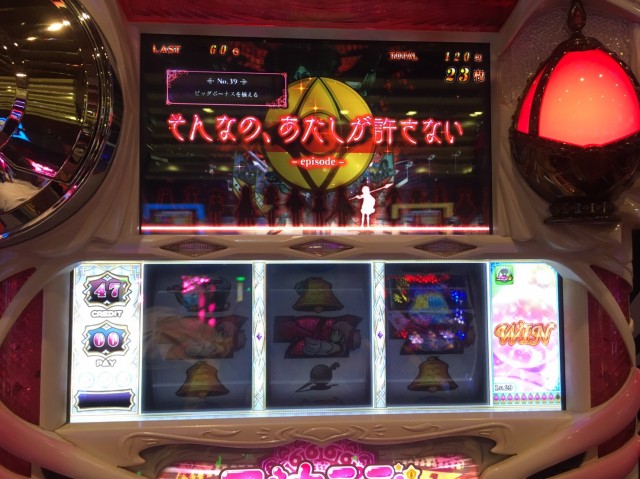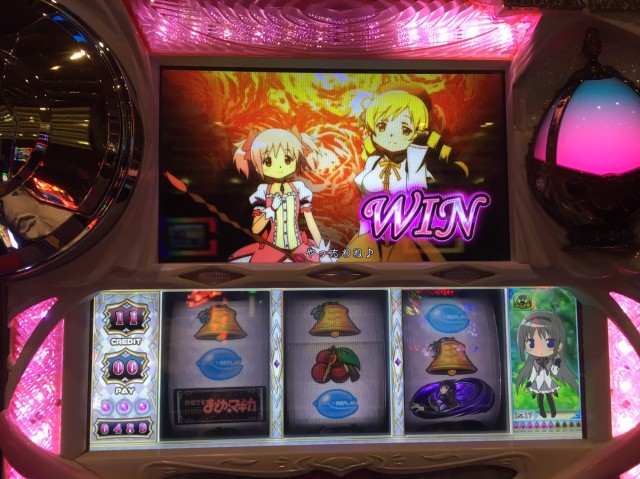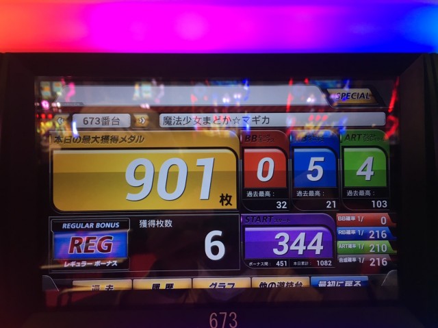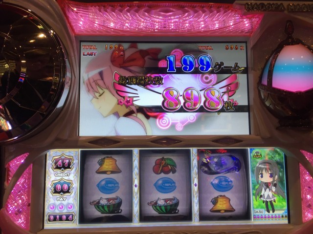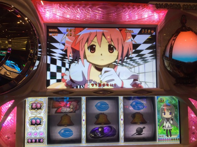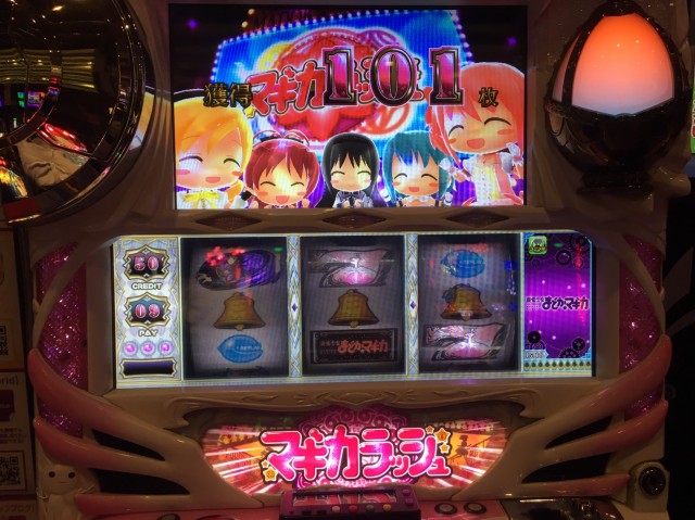ダメもとで覗きに来たわけですが、大当たり0回、150回転の「まどマギ」が奇跡的に空いており、まだ周りに目立つ台もないため、設定狙いで打ちだします。設置は6台。