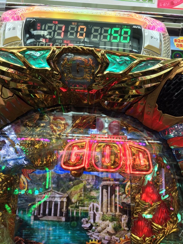 そして打ち続けること150回転。騒がしい展開も無い中、ふと後ろを見ると潜伏確変のまま空き台となっている『CRミリオンゴッドライジング~ゼウス再び~』を発見。