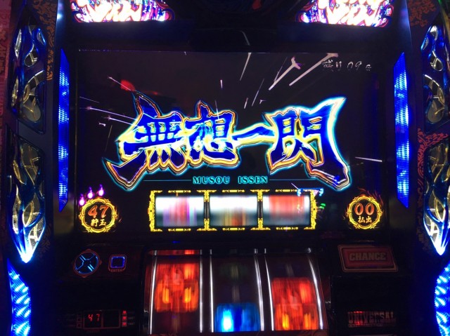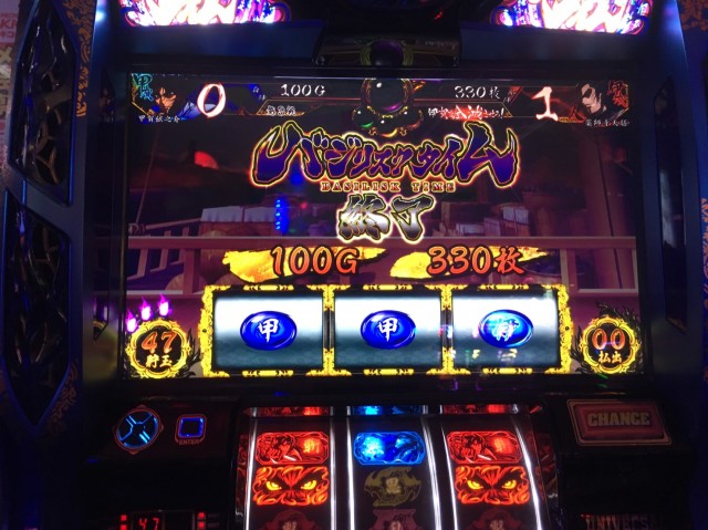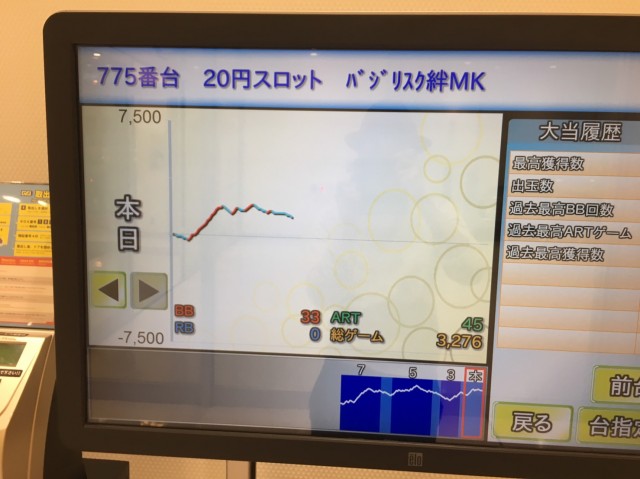 狙いをつけた4台の内の1台が空きました。台に設置のデータランプ画像は非常にわかりづらい仕様だったため割愛させていただきます。100点のグラフかと言われるとそうではないので、少し腰は浅めで急いで打ち進めます。