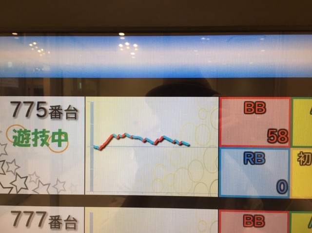 一直線に下降している台が3台ほど、きれいに出てる台も3台ほど。その他の台も、かなり出玉を揉んでいるような感じです。ちなみに僕の隣の776番台では「3ベル」が出てました。あまり驚いてる様子もなく、さっさと打っている感じだったので、2回目だったのかな?