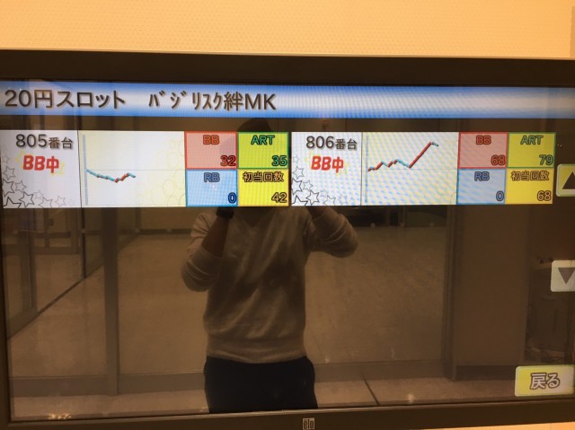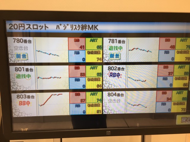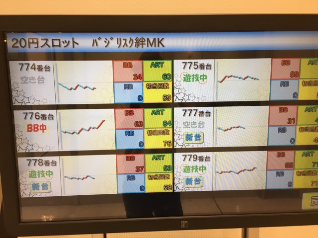 ちなみにこのお店では、タッチパネル式のテレビモニターで台データがチェックでき、非常に便利でした。このテレビモニターで絞った狙い台は4台。