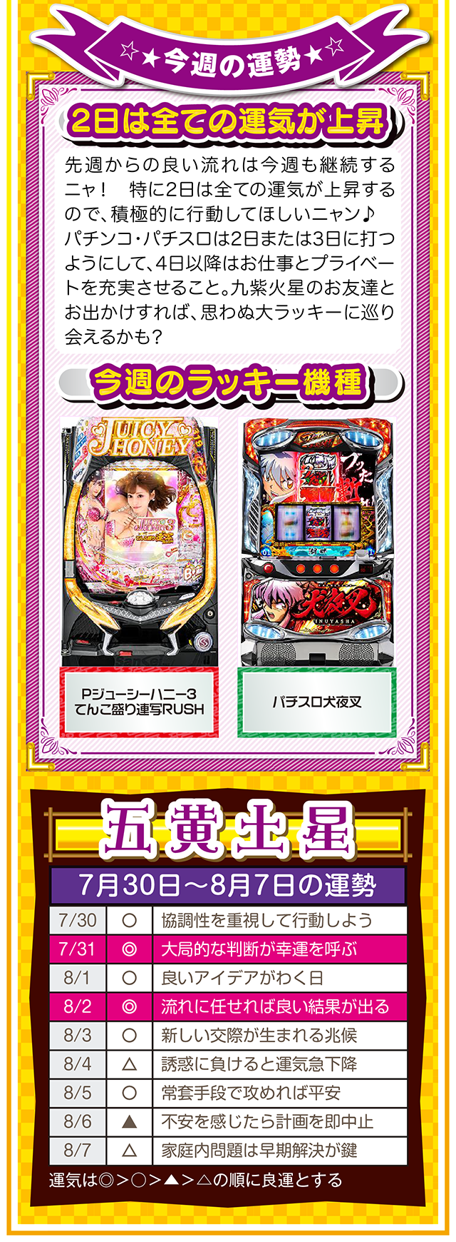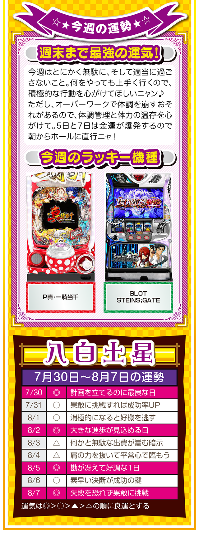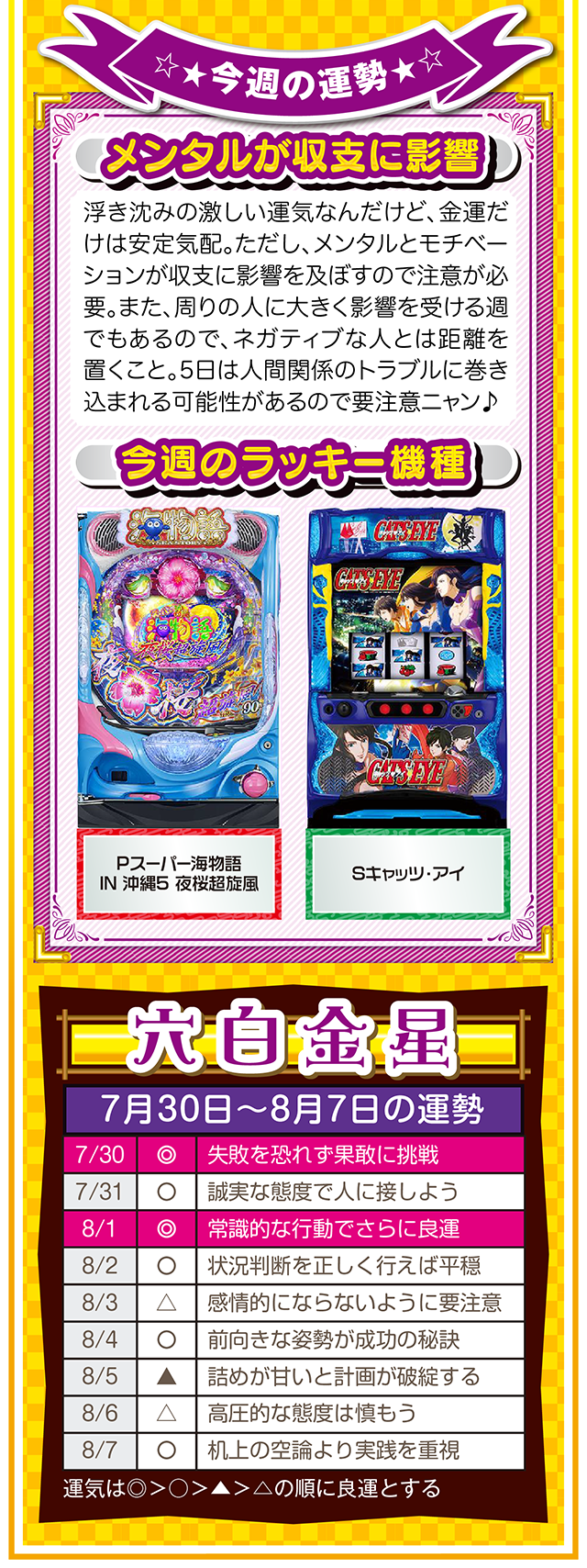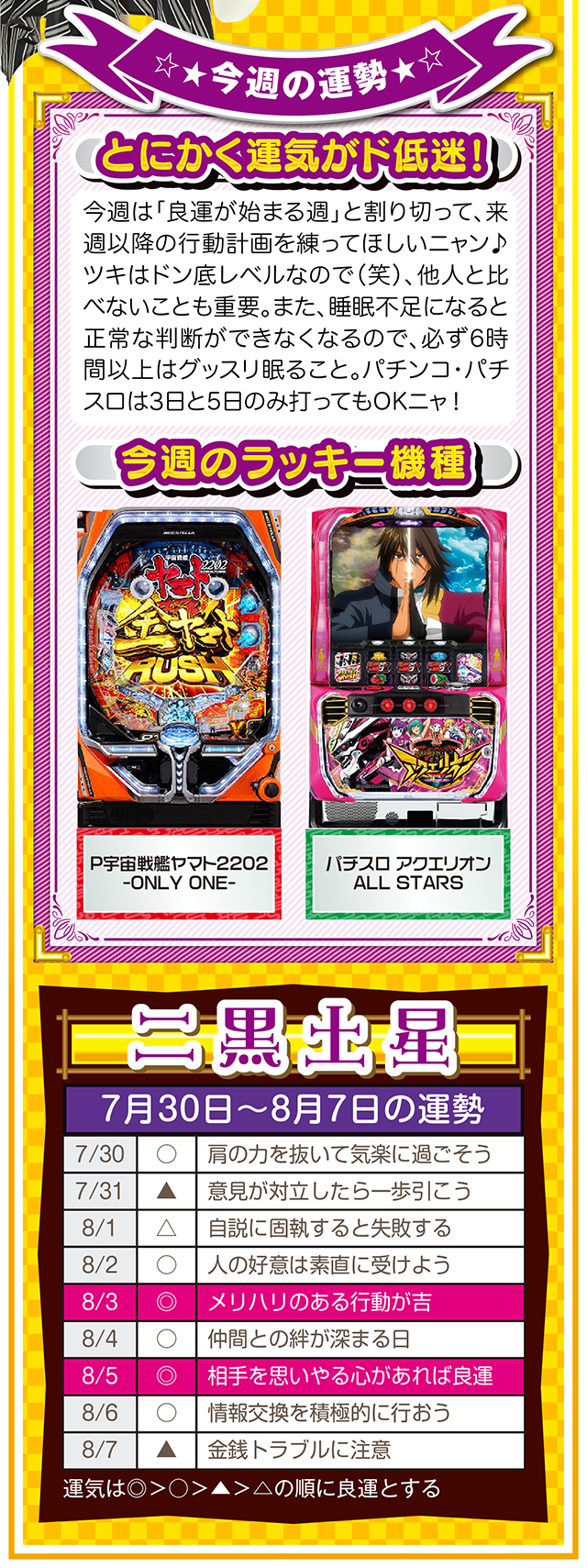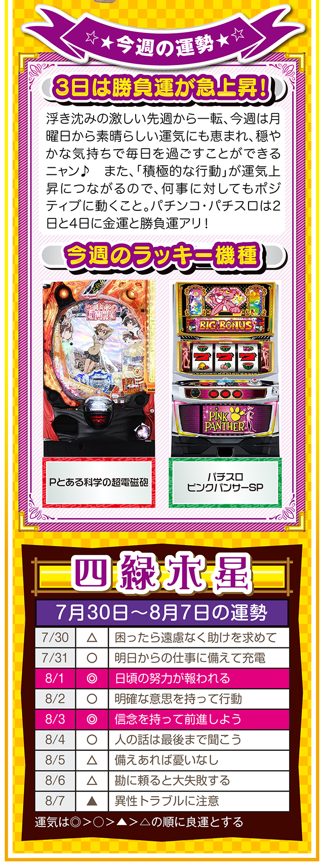 他人を見下したり、他人を馬鹿にしたりするのは、相手に変わってほしい願望があるから。相手を変えるのではなく、自分自身が変わる。自分自身が変われば、運気の流れも変わることを覚えておいてほしいニャン♪ というわけで早速、8月1日から8月7日の1週間を鑑定ニャ(あなた色に染まりたい願望全開のフォー・チュンチュンが、オマケとして7月30日と31日の運勢も鑑定したニャン♡)!