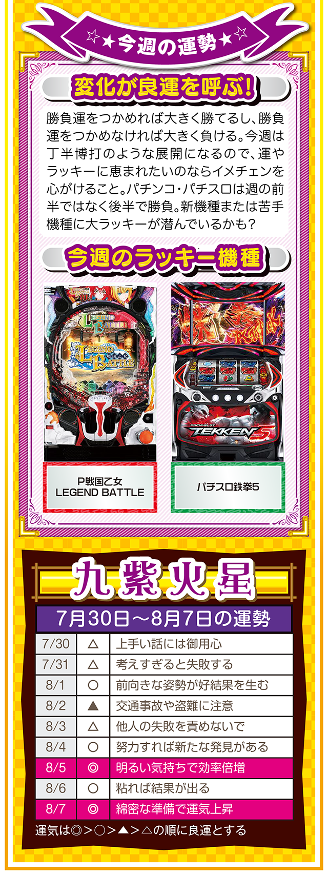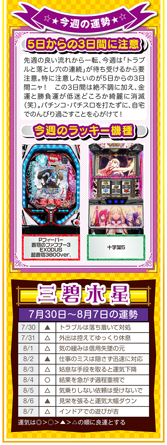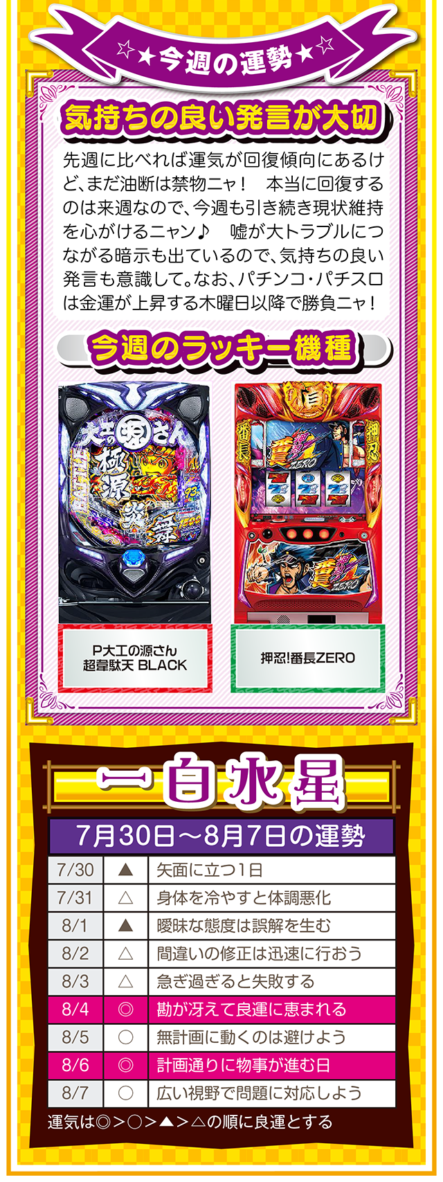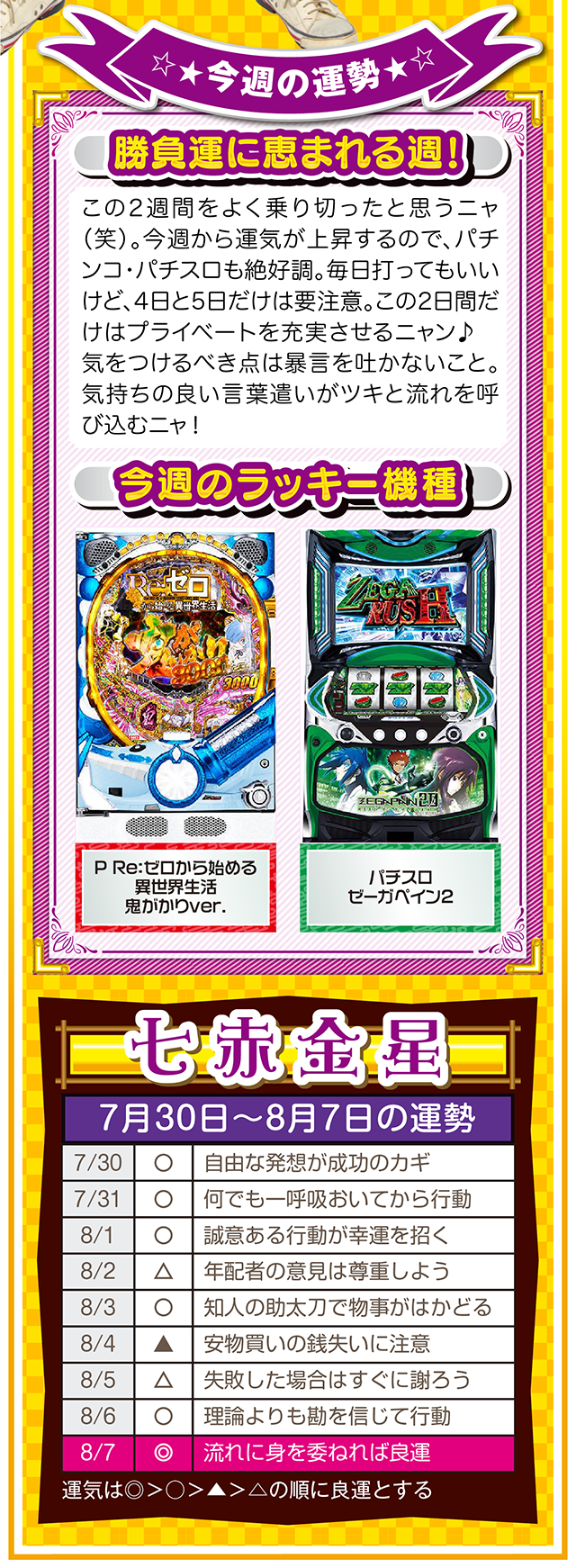他人を見下したり、他人を馬鹿にしたりするのは、相手に変わってほしい願望があるから。相手を変えるのではなく、自分自身が変わる。自分自身が変われば、運気の流れも変わることを覚えておいてほしいニャン♪ というわけで早速、8月1日から8月7日の1週間を鑑定ニャ(あなた色に染まりたい願望全開のフォー・チュンチュンが、オマケとして7月30日と31日の運勢も鑑定したニャン♡)!