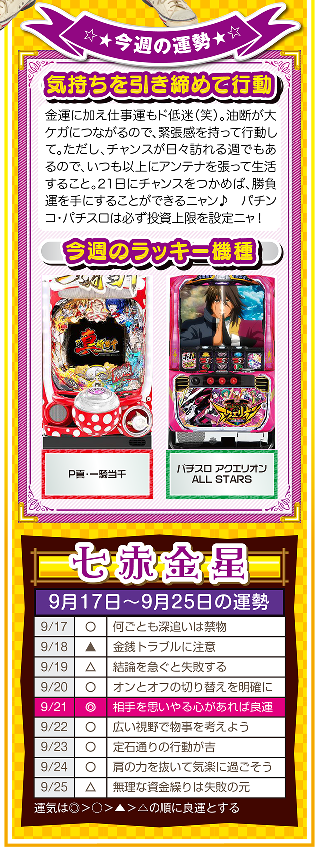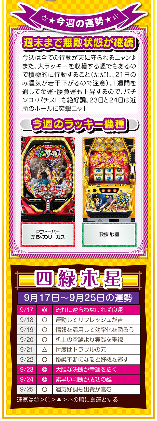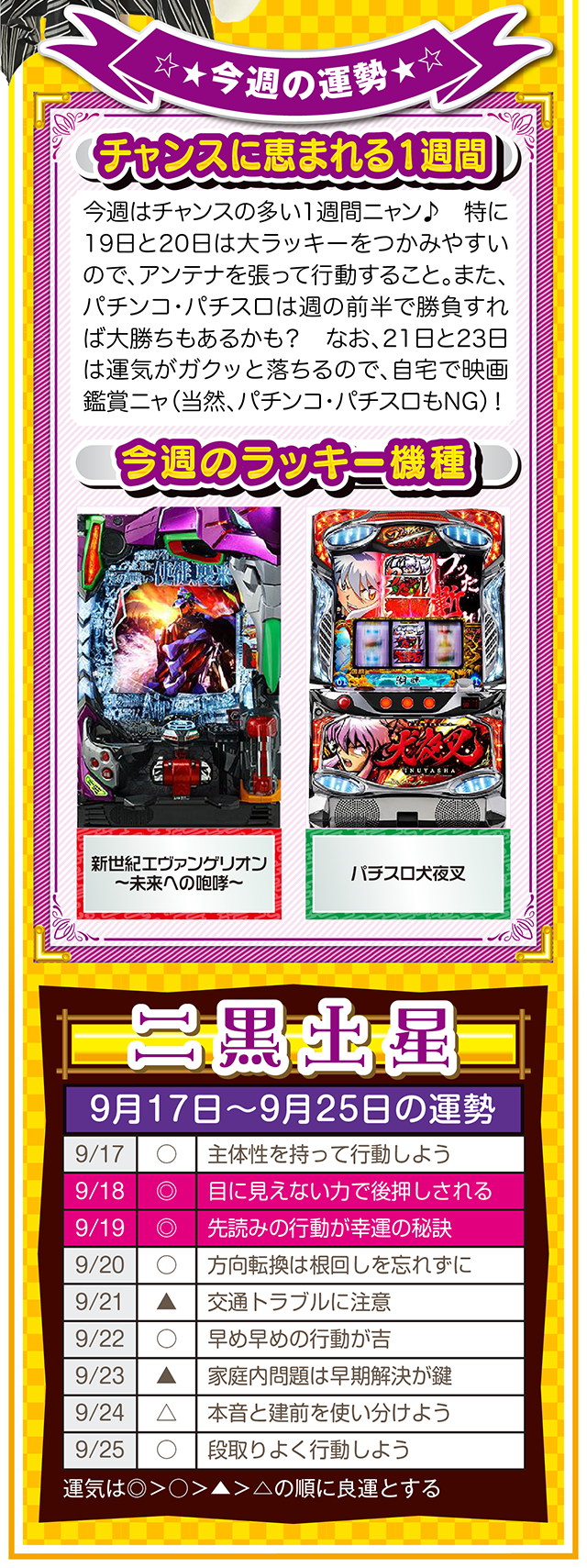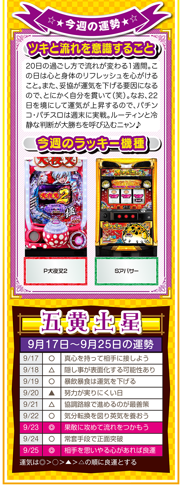 上手く進まない状況を楽しみつつ、不平不満と愚痴を未来への希望に繋げる。本当に頑張っている人に、運とかツキが味方することも覚えておいてほしいニャン。というわけで早速、9月19日から25日の1週間を鑑定ニャ(それでもマッチングアプリに登録する勇気がないフォー・チュンチュンが、今週もオマケとして17日と18日の運勢も鑑定したニャン♡)!